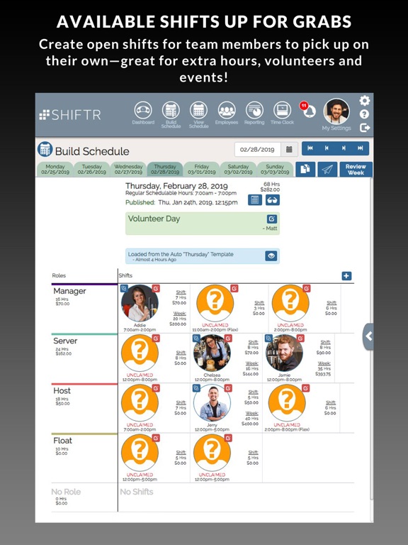 • Create open shifts for team members to pick up—great for extra hours, volunteers and events!