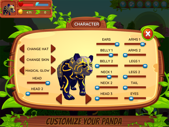 Customize the appearance of the panda as you like. There are many skins to choose from. You can customize skins for your spouse and children. You can add various beautiful magic signs or even put on a funny hat. For a more accurate adjustment of the panda appearance, you can change its head, ears, abdomen, neck, front and back paws, tail, eyes.