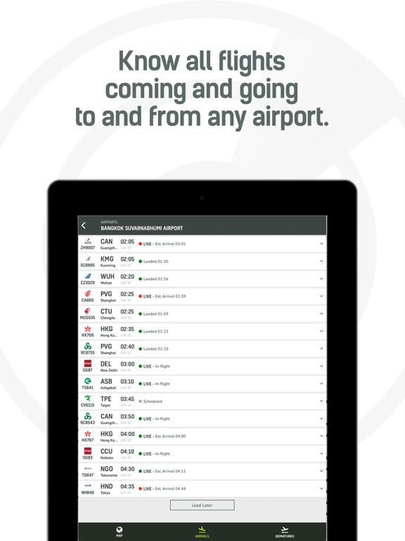 - Airport view: know all flights arriving or departing from an airport as well as other status information about each airport such as weather and visibility conditions.