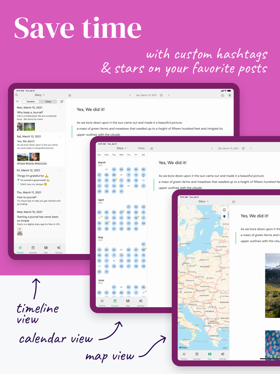 • Calendar, map, and timeline views to jump to past and future entries with ease