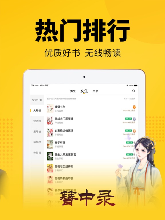 免费看书到永远,七猫免费小说! 【海量小说免费看】 重磅新书《摸金校尉之九幽将军》:天下霸唱力作,徐克执导,陈坤主演,超奇幻荧幕巨制同名改编原著~ 全网搜罗古言、现言、玄幻、都市等热门分类小说,一口气免费看到大结局!除了《九州·斛珠夫人》《余生,请多指教》《青簪行》等热门影视IP原著,更有《局中人》、《隐秘的角落》、《帝王业》、《东宫》、《双阙》等新进好书,你想看的全都免费! 【排行精选找好书】 每天为你推荐好书,大热榜、完结榜、黑马榜、热搜榜,帮你花样找到当下最热好书,摆脱书荒,看完一本还想看!