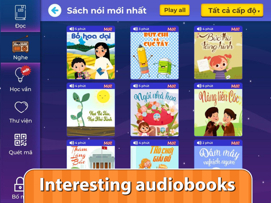 300 audiobooks in VMonkey collect the best works from 4 genres: Classic stories, Poetry, Moral lessons, Fairy tales and folklores. Famous stories in the world are also adapted to Vietnamese traditions and cultures. All audiobooks are not only content-rich with meaningful life lessons, but are also very appealing to kids, with lively sound effects, music and voice of multiple narrators. Thanks to audiobooks, children can absorb the stories more easily, and have a better look at their surrounding life. Audiobooks in VMonkey are expected to enrich children’s knowledge of every social aspect, as well as the beauty of Vietnamese language.