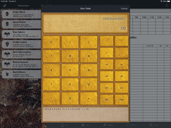 • In each sheet, tap with 3 fingers on the screen to instantly show the dice table