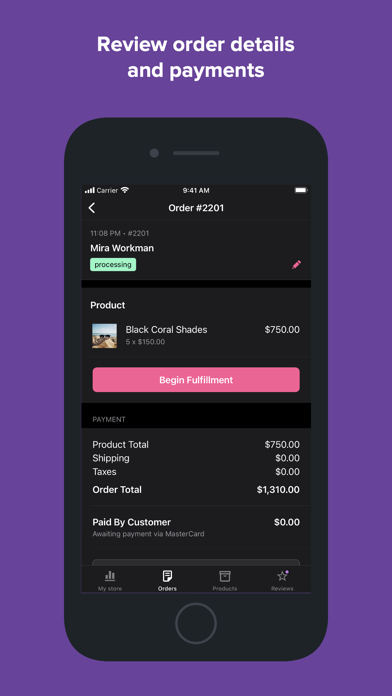 Scroll the summaries, or search by customer or order specifics. Tap into the details to see itemized billing, begin fulfillment, and change order status. Add notes to the order or email customers directly to follow up.