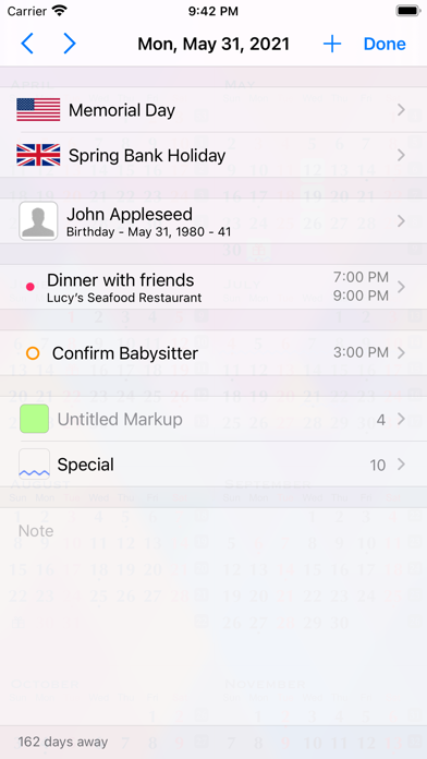 • Day view that lists events, holidays, birthdays and anniversaries, markups, daily notes, and a "how many days away" count