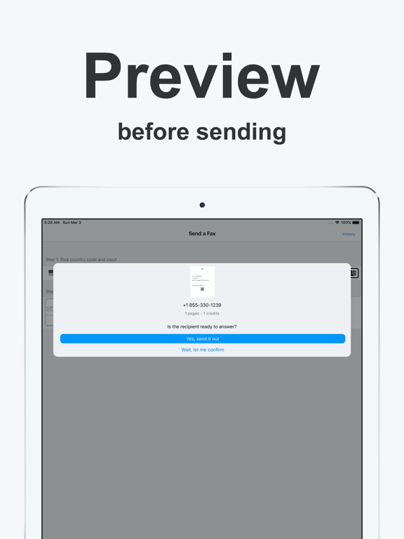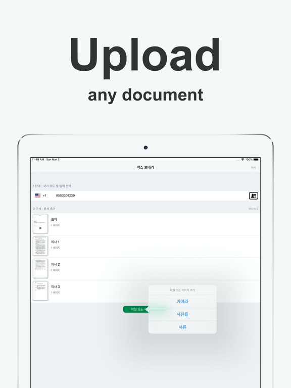 - Send a fax (three taps): input the recipient's fax number, pick your document and send out!