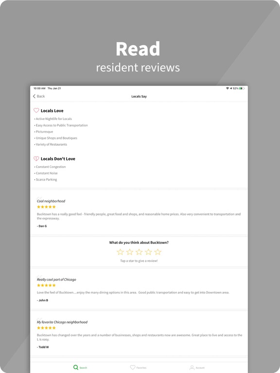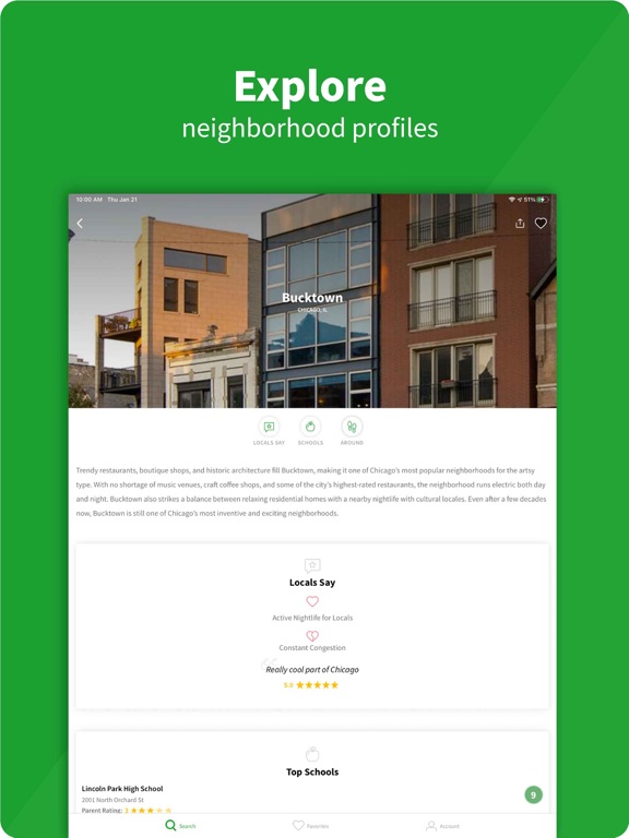 • Read resident reviews on neighborhood profiles for a local’s perspective and insights into an area.