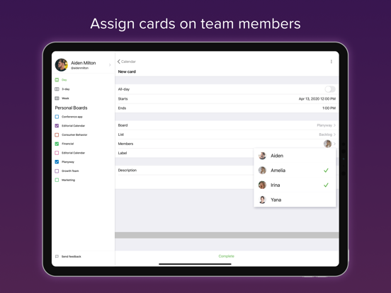 – Plan due dates by dragging and dropping cards to the calendar