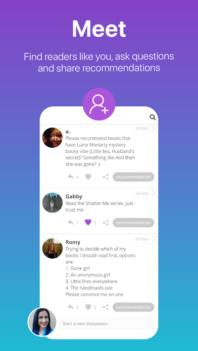 Connect with your book community: Create a new bookish discussion and follow your friends and fellow book lovers everywhere. Share your favorite books with them.