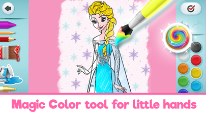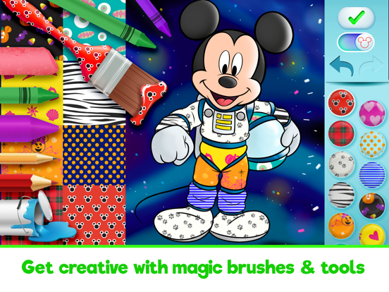 Choose from a selection of brushes, crayons, markers and magic tools to work with (it even supports Apple Pencil). Give Frozen’s Elsa a blazing red dress or Mickey Mouse spotty green ears. How would Simba look with stripes like a zebra? The sky’s the limit! For little hands that might not have mastered the art of coloring yet, there’s even a Magic Color tool that fills in all the colors perfectly.