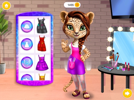 Animal style icon Amy the leopard opened her own Animal Hair Salon for cats! Meet her first fluffy clients and help them get their dream hair and fashion makeovers! Wash, brush, curl, straighten, color and style the cats’ beautiful hair! Dress the cats up in colorful trendy clothes!