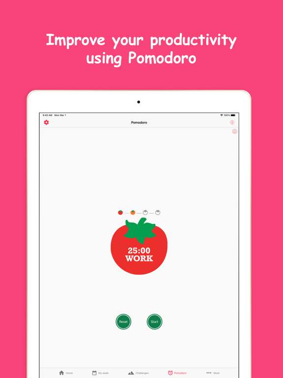 Pomodoro clock is integrated into the app will help you in case you apply the Pomodoro method to get more productiveness when doing your work.