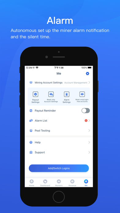 The F2Pool Mobile App offers the best mining experience. Conveniently manage your mining machines and view your mining revenue, while utilizing our one-click switch between address mining and anonymous mining. Our App also offers hashrate monitoring, mining machine status alerts, custom alerts, mining hardware comparison, and proof-of-work currency rankings, providing our miners with the most comprehensive information to manage their mining operations.