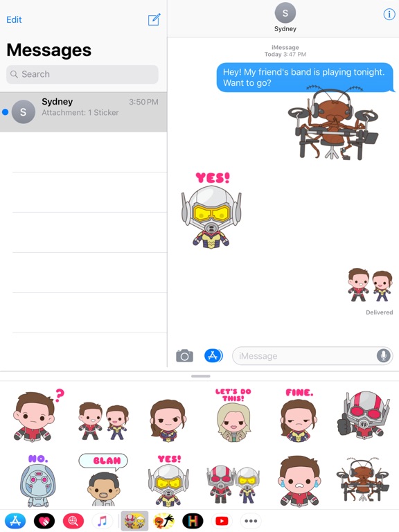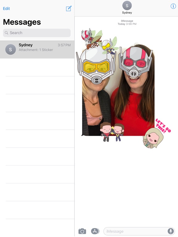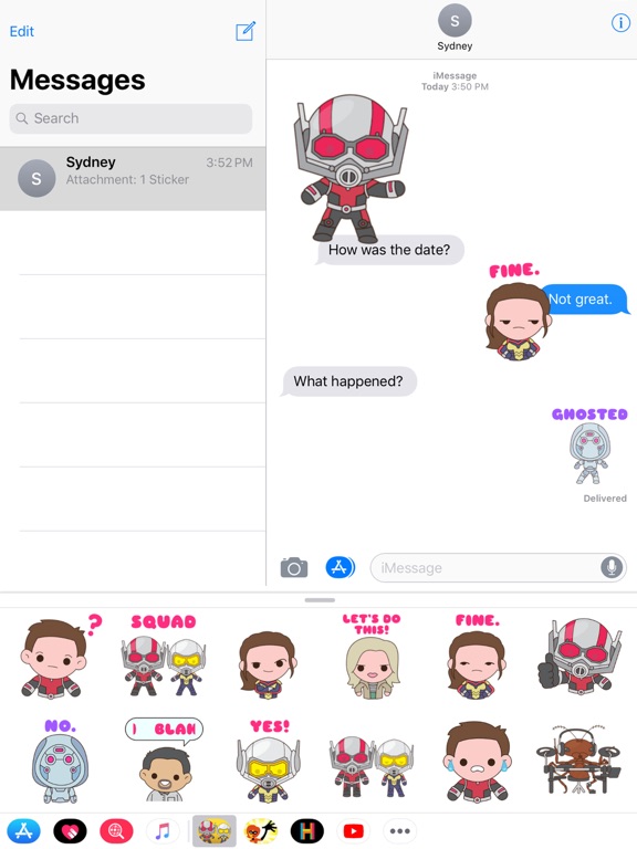 Real heroes. Not actual size. Make your iMessages bigger than ever with this pack of 24 larger-than-life Marvel Studios’ Ant-Man and The Wasp stickers. Download these fun-sized animated stickers including Ant-Man, The Wasp, Ghost, Hank Pym, Janet Van Dyne and more.