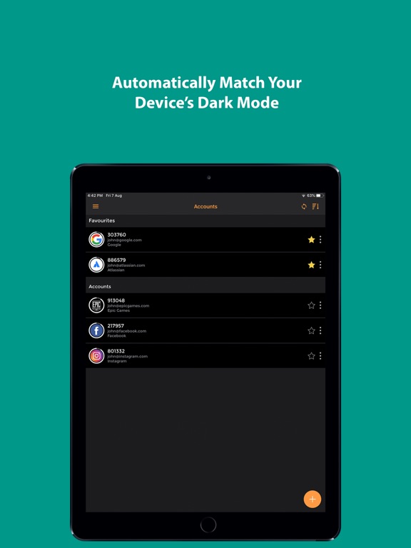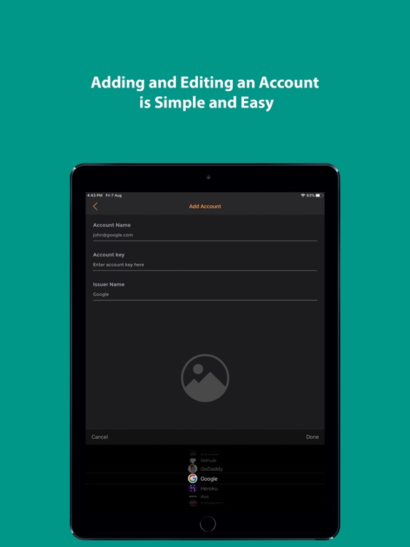 The app allows you to set unique icons to your accounts, either by selecting icons from the provided list or by uploading them. This helps you to easily recognize and sort your accounts.