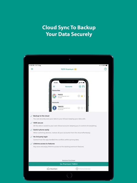 Never lose your codes again! With Cloud Sync, you can easily backup your 2FA data to your iCloud. This keeps you in total control of your data while providing effective cloud backup.