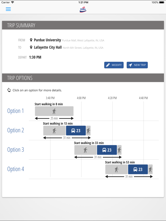 Lafayette, Ind. –July 15, 2018--CityBus is rolling out MyRide, a new GPS-based bus location system. Using MyRide, riders can access transit schedules and real-time GPS-based bus location information, track their bus on a map, and receive transit news and route-specific alerts.