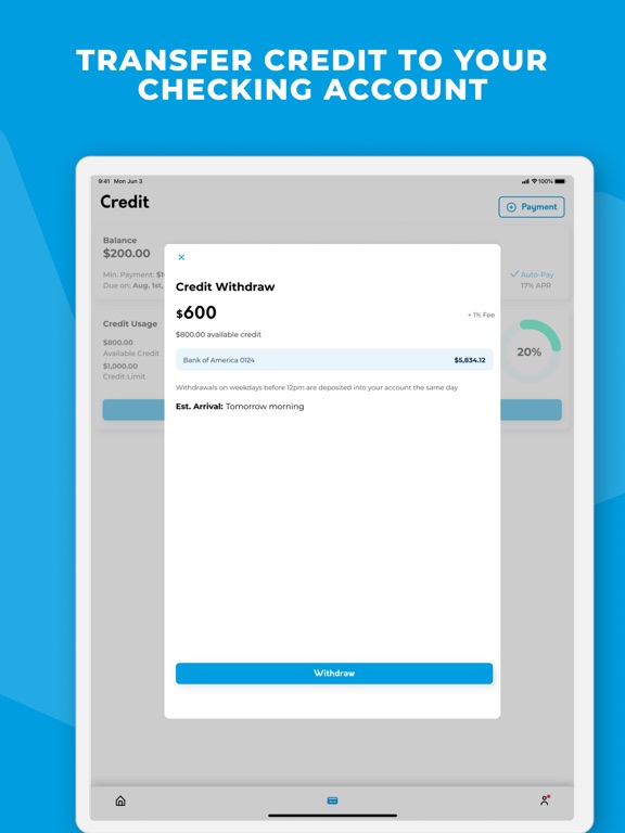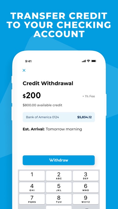 • Use credit - transfer credit from the app to your linked checking account and use it as you typically do from that account.