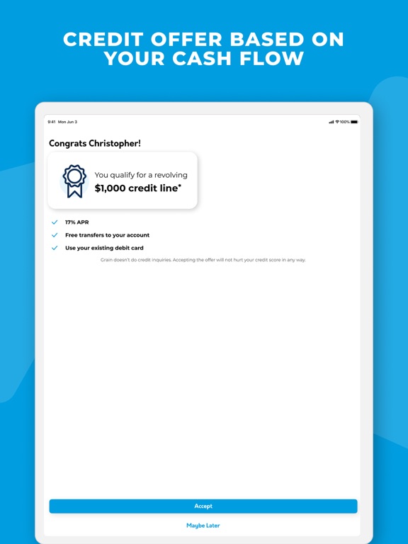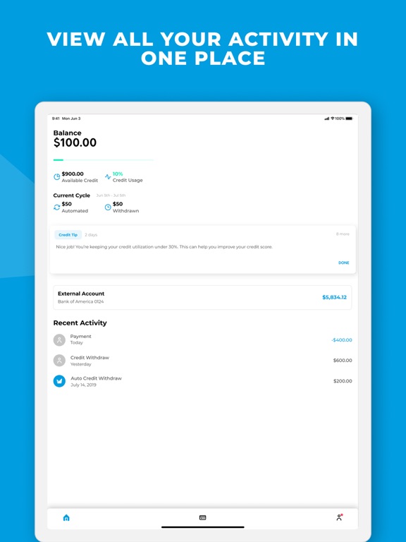 • Get credit in minutes - link your primary checking account and get access to credit in minutes. No credit check. No rejections.