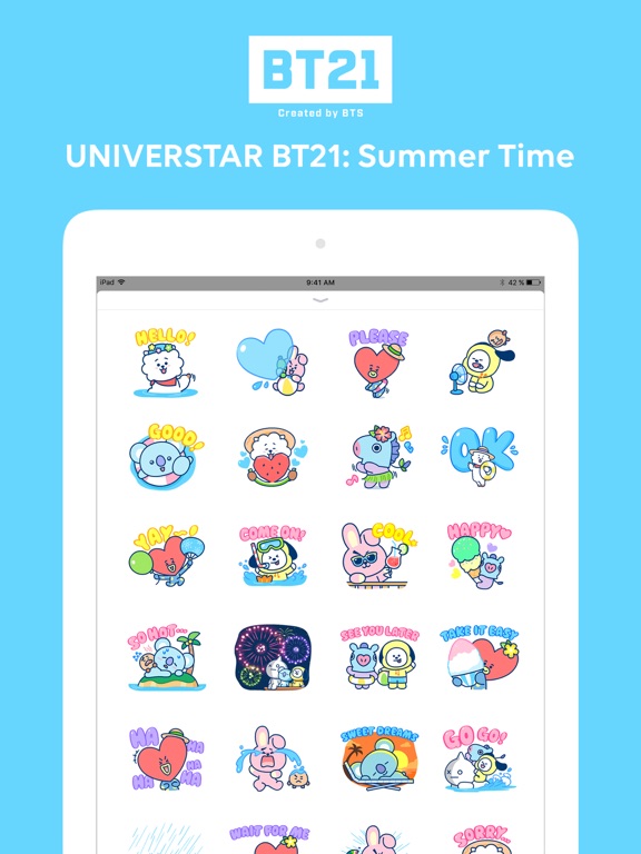 UNIVERSTAR BT21 heads to the sea to beat the heat of a scorching hot summer day! Be as cool as the ocean with your best BT21 friends all over your chats.