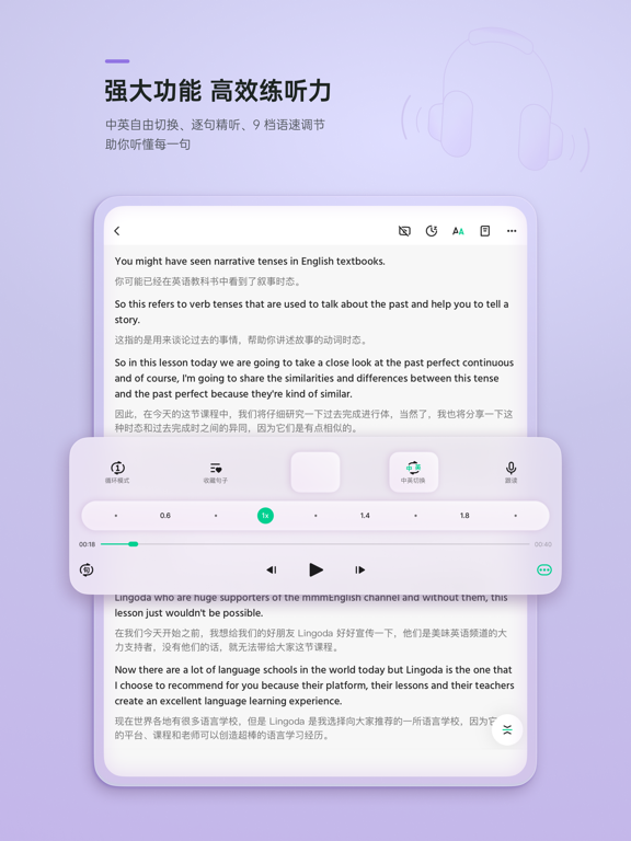 音视频课程均配有中英同步课文,还可切换为单语/无课文模式练习听写和翻译