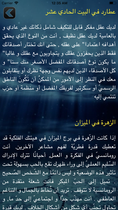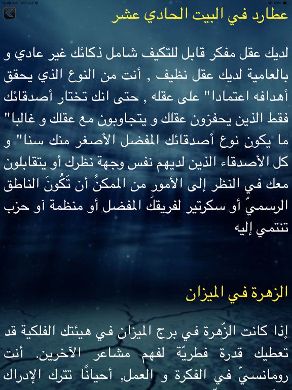 التطبيق الاول والوحيد الذي يوفر لك الامكانية على الحصول على الخارطة الفلكية الشخصية او ما يعرف بالهيئة الفلكية (chart wheel ) مع تفاصيل وشرح مواقع ووضعيات الكواكب ساعة الولادة والحصول على تقرير مفصل وباللغة العربية والتي تكون ادق من توقعات وحظ الابراج الفلكية حيث ان صفات البرج تكون عامة وليس بالمطلق تنطبق على صاحب البرج ولكن تفسير وتحليل الخارطة الفلكية يكون اكثر دقة وتنطبق علينا بشكل كبير على شرط ان تكون المعلومات المدخلة دقيقة وصحيحة وخاصة ساعة الولادة.