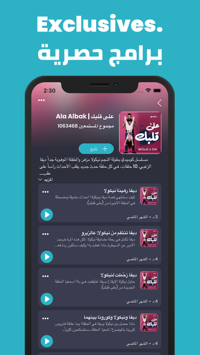 With an ever-growing selection of top-notch original & exclusive podcasts and Arabic shows that you can find ONLY on Podeo, the Podeo Network brings you all your favorite shows from the Arab world. No more wasting time searching for podcasts on multiple apps; you are bound to find what you are looking for. We bring Arabic, English, and French podcasts and shows that are produced in the Arab world right to your pocket on a wide range of popular categories like: