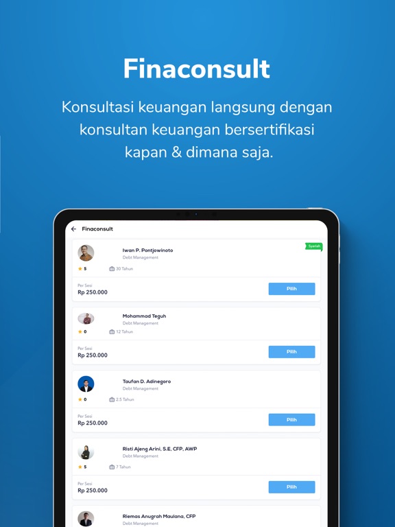Fitur terbaru dari Halofina. Sekarang kamu bisa konsultasi keuangan langsung dengan konsultan keuangan bersertifikat secara mudah, aman dan professional dengan biaya yang terjangkau. Seluruh konsultan keuangan telah terkurasi oleh Halofina dan ZAP Finance sebagai partner.