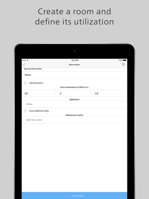 With this app you can gather information about a room and create a lighting system. You will immediately receive details of the number of luminaires and their positions that are needed to meet the normative requirements for lighting a room.