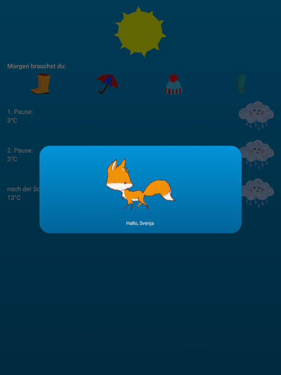 Dein stetiger Begleiter, der Wetterfuchs, hilft dir das Wetter immer im Blick zu haben. Er zeigt dir täglich das aktuelle Wetter an und was du für den Schultag zum Anziehen benötigst.