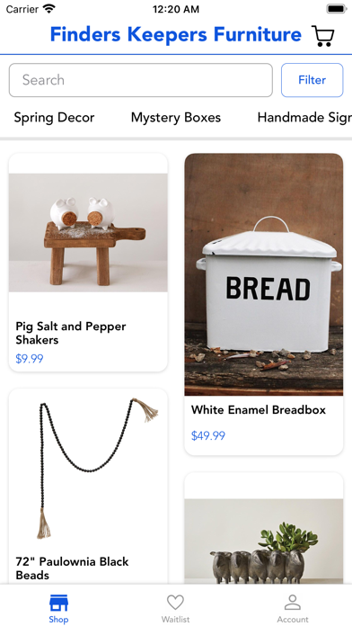 Welcome to the Finders Keepers Furniture App! The best way to shop with Finders Keepers Furniture on iOS! About Us: Rustic home decor and furniture. Features: - Browse all of our most recent arrivals and promotions - Easy ordering and checkout - Waitlist items and purchase them when they are back in stock - Email notification for order fulfillment and shipping
