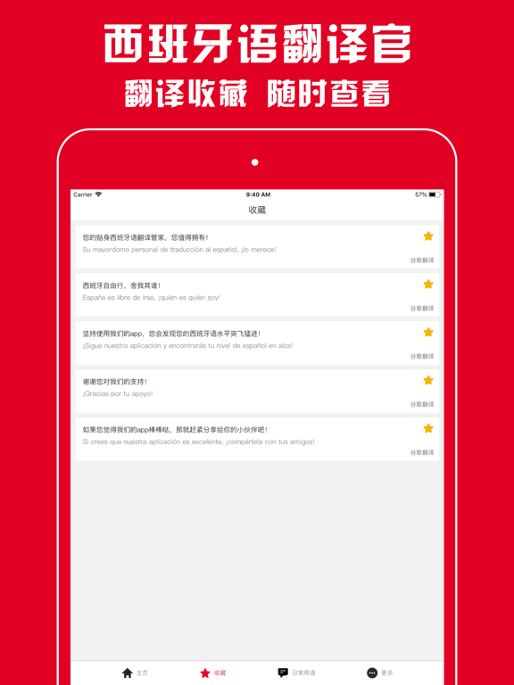 西班牙语翻译官为您提供了百度/谷歌翻译引擎,随时比对翻译结果,同时提供了智能语音识别引擎,无需手动输入,动动口即可快速获得精准的翻译结果,效率妥妥哒!西班牙旅游不会西班牙语怎么办?没关系!借助语音翻译功能,说中文对方也能听得懂,西班牙旅游妈妈再也不用担心了,交流妥妥哒!工作、学习、生活、旅游的西班牙语神器,也许这就是东半球最好用的西班牙语翻译App了,还等什么,赶紧体验吧!与西班牙语翻译官一起成为人人手中西班牙语学习、居家旅行的必备工具。