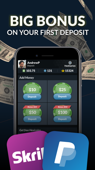 Deposits start at $5 and can be done with PayPal or Skrill. When you make your first deposit, we’ll give you a bonus for some extra opportunities to win real money.