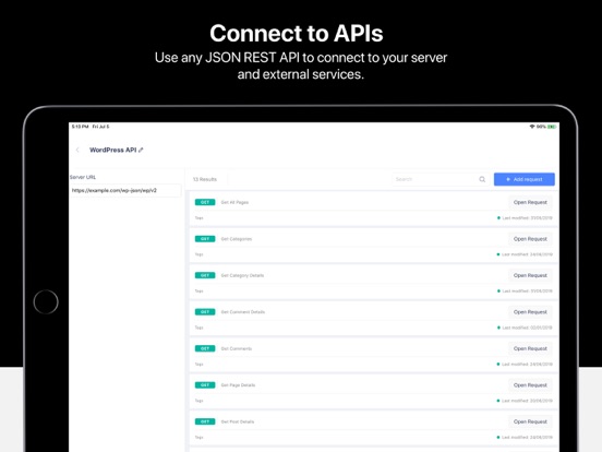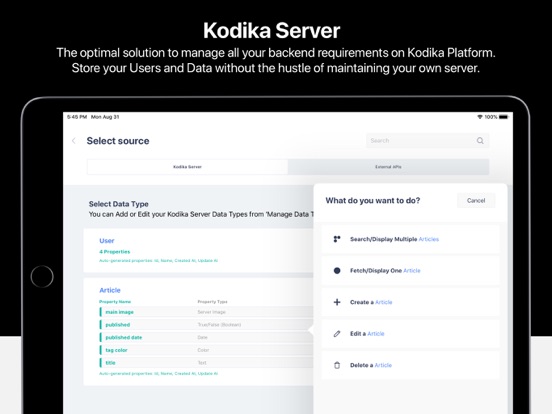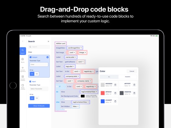 Design custom screens, give them life by connecting code blocks, link your REST API and later live test your apps in the Kodika app, without the need for other external tools.