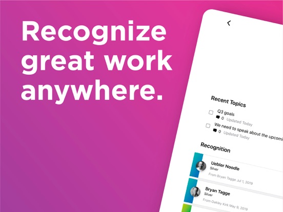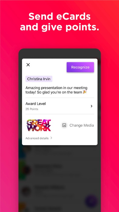 Once synched, your app will seamlessly reflect all the details of your desktop recognition program. But in the palm of your hand. It’s totally secure. And it makes employee recognition fast, fun, and easy.