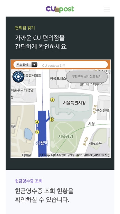 편의점 찾기 : 택배 서비스 이용이 가능한 CU점포를 검색하여 위치 확인이 가능합니다.