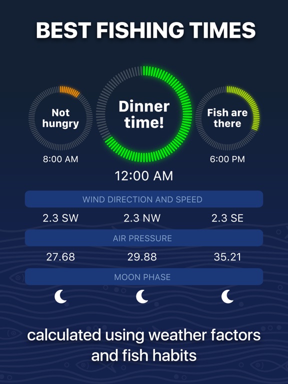• Scientifically calculated fishing forecast for each fish spot.