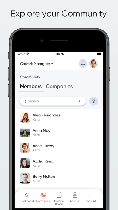 App is designed for members to facilitate connectivity and spot utilisation. CoSpotters / members can reach out to each other, find each other in the directory, read and post information to the message boards to add and edit booking of CoSpot's meeting rooms.