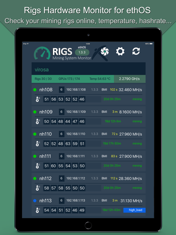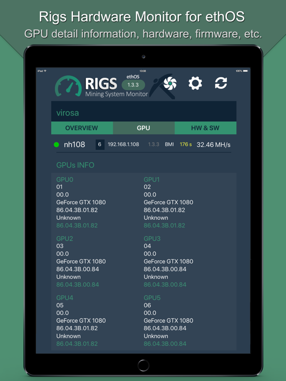 It is necessary to control principally the temperature of your hardware to prevent overheating. This is what makes this app - show every main hardware values of ethOS linux distribution. Check your mining hardware in your mobile.