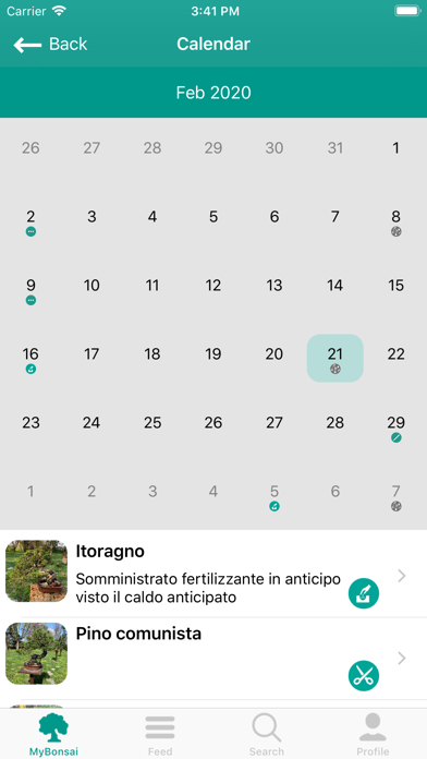 • One of the main feature is the possibility to save and store a trace of works applied to your small trees. Take care to your bonsai and save all kind of works like Irrigation, Fertilizing, Pruning, Wiring, Repotting, Propagation, Fungicide, Acaricide, Defoliate, Woodwork, Grafting, and so on…