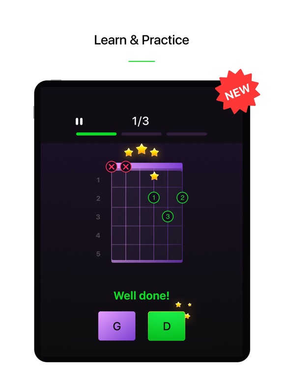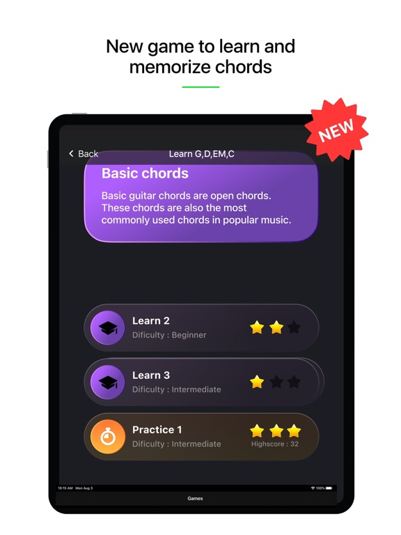 But wait, we have something else for you! Thanks to a huge library of 2640 chords, Tuner offers you the possibility to discover and play many new music notes. Need one chord in particular? Don’t lose your time and use directly the search function! This useful library also permits to visualize all of your chords. And don’t worry, we made the app intuitive and easy to use so you can learn quickly and in good condition.