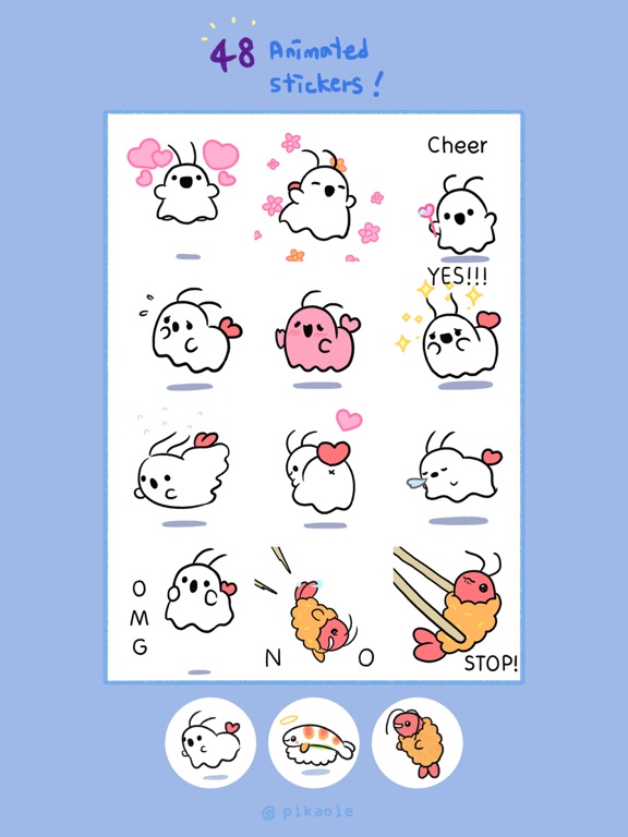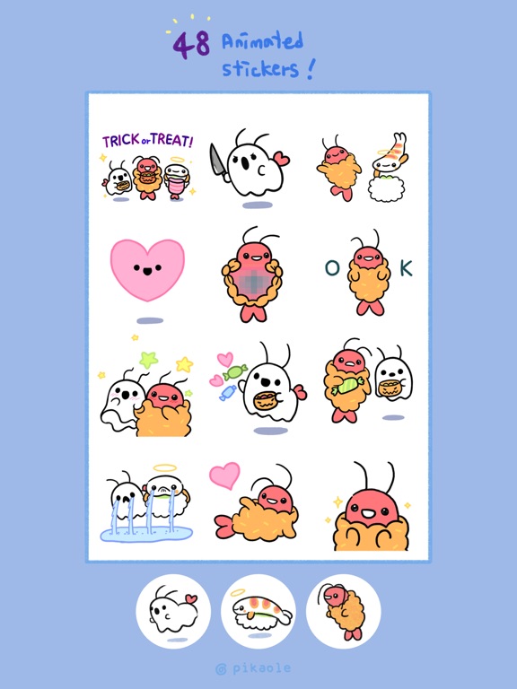 48 animated shrimp sticker packs. ( ghost shrimp, Fried shrimp, shrimp sushi) Enjoy halloween and have fun! twitter / instagram : @pikaole