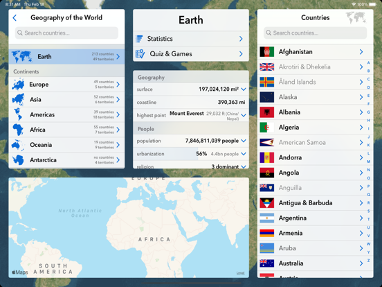 This app is an ideal companion for people who want to learn more about geography. It includes more than 50 thousand facts about more than 250 countries and territories of the world. In addition to browsing the data, you can play 9 types of quiz games about flags, capitals or location of countries.