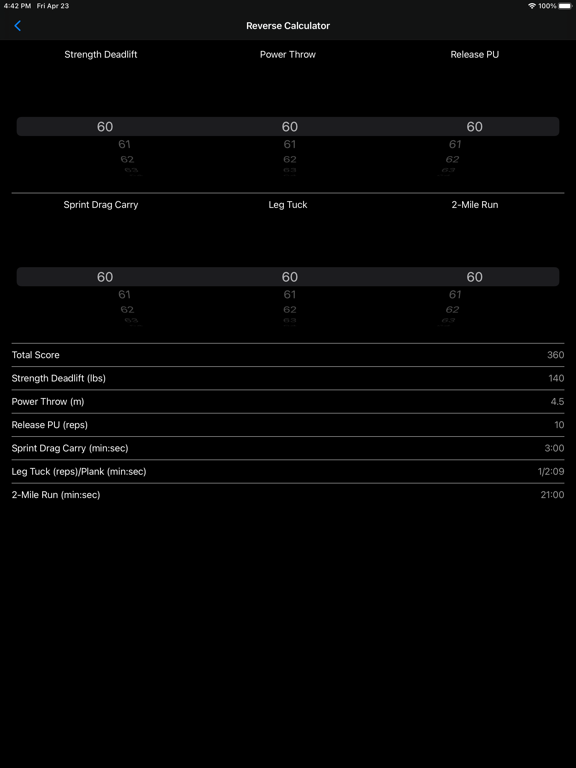 - Reverse Calculator: Enter the ACFT score you want and find out exactly what you need to do to get it. It doesn't matter if you are striving for the bare minimum or going for some incentives and looking at all 100s - this is the app for you!