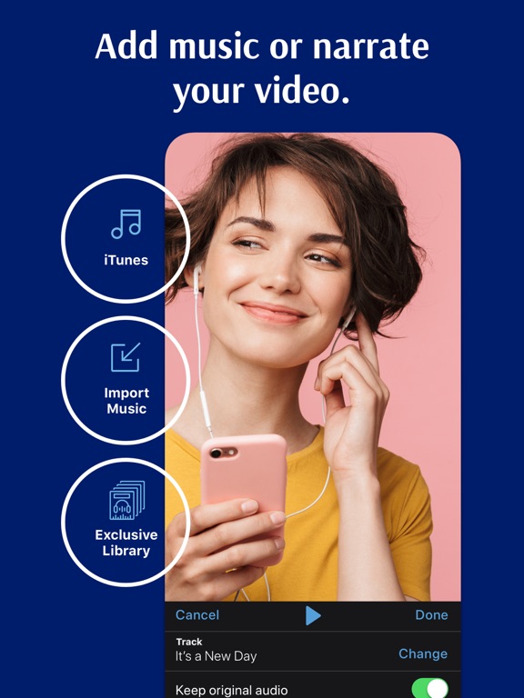 • Insert videos from your camera roll, existing recordings, or add stock to create intros and outros