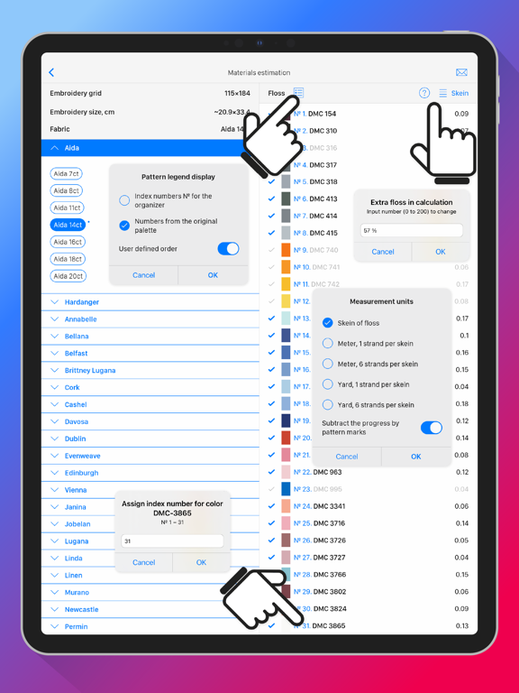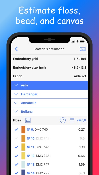 - Use the built-in calculator to estimate materials (fabric, floss, and beads)