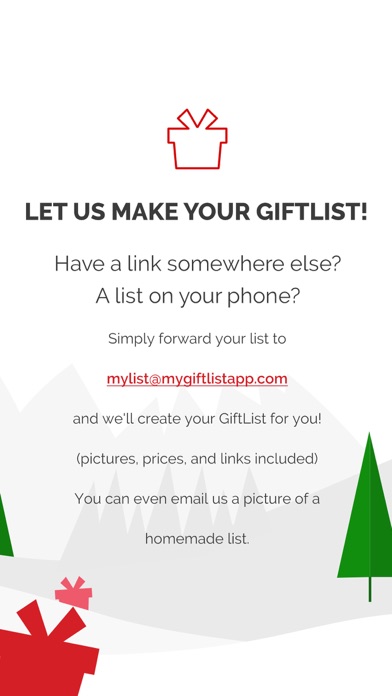 Send previously-created gift lists from other websites to [email protected] or simply snap a picture/screenshot of a homemade Christmas list and email it to us. Let us create GiftLists for you and help you start your Christmas wish list!