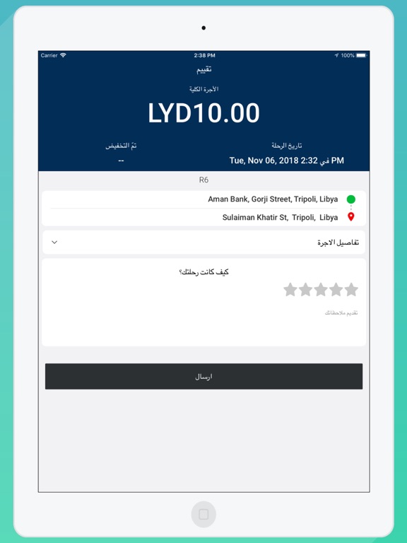 عند انتهاء الركوب، يمكنك تقييم السائق وكتابة تعليق لتمكننا من تحسين خدمة العملاء. أيضا سوف تتلقى بريد إلكتروني بإيصال الاستلام.