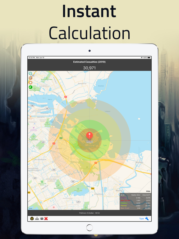 This app can be use to experiment with range of thermal radiation, radius of radio active fallout and possible number of casualties. It includes list of popular weapons in human history, such as Little boy, Fat man and Tsar Bomba.