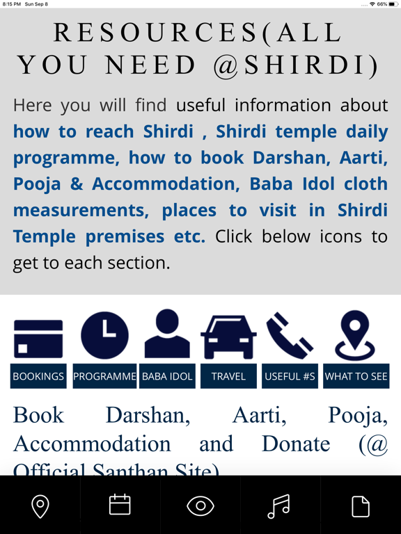 Experience Live Shirdi Sai Darshan / Shirdi Sai Baba Live Darshan from Shirdi, play / listen Shirdi Aartis, Sai Chalisa, Sai Prashnavali / Sai Answers / Ask Saibaba, Sai Satcharitra, Guru Charitra / Gurucharitra, Sai Namavali (108), Sainath Manjiri, Sai Vishnu Shasranama, Guru Pathache Abhang, Sai Jap and Sai Meditation. Read Sai Satcharitra and Aartis in 10 plus languages. Access Sai Baba photo gallery, explore worldwide Sai Temple locations and find nearby Sai Temple(s) based on your location. Find useful information about how to reach Shirdi , Shirdi Temple daily programme, Baba Idol cloth measurements and how to book Darshan, Aarti, Pooja & Accommodation. Additionally, find emergency and other contact details.